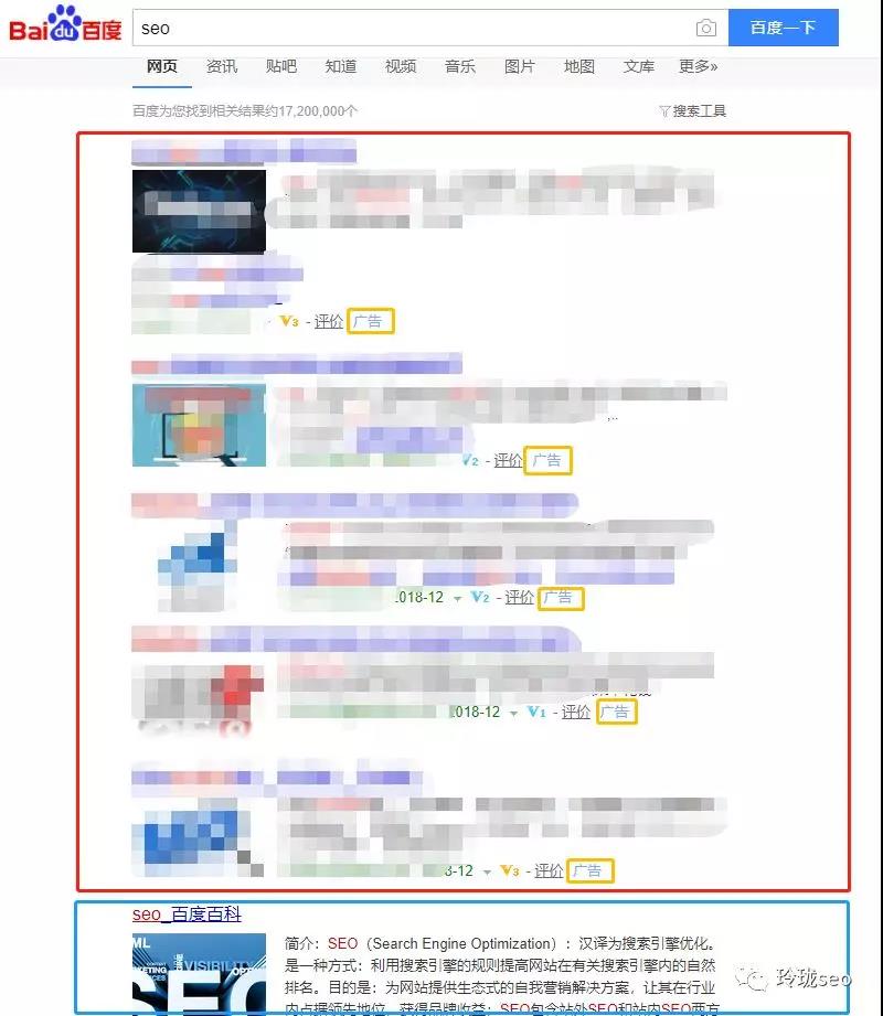 為了避免打廣告嫌疑,敏感信息打了馬賽克。可以看到紅框中都是sem的展示結(jié)果,每一條記錄分別都被打上了“廣告”的字樣,也就是說他們都是參與搜索引擎官方付費(fèi)推廣的,你點(diǎn)擊一次他們的網(wǎng)站,他們就要花掉一筆推廣費(fèi)用。這也是人民幣玩家的游戲。而籃框中的seo百度百科結(jié)果便是seo優(yōu)化做上來的第一名。舉個(gè)這樣的例子大家能更好的理解seo和sem的區(qū)別了嗎?